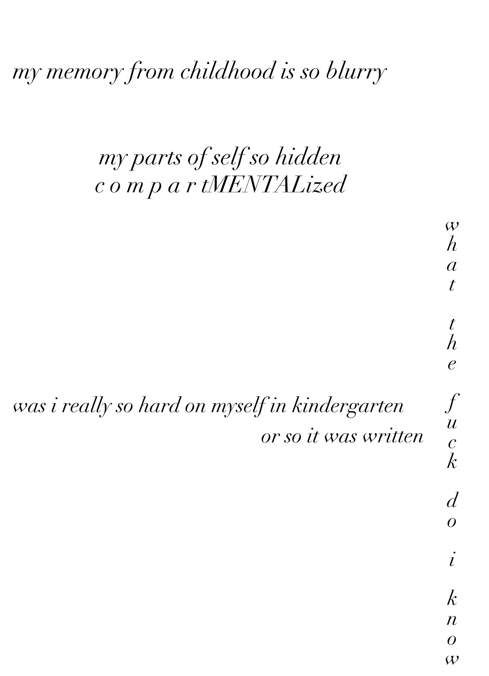 Pathos investigates how we see ourselves, as women, and as humans – our mental health, our depression, anxiety, and connections to others. Using grit, grain, texture, ground glass, painterly blur, and multiple camera lenses, I obscure myself as the subject to reveal emotions hidden under the surface. By placing myself in front of the camera, I chose to share my vulnerability in order to normalize the dark-yet-relatable moments I believe we all share. Women in particular are held to beauty standards which can prevent them from sharing their deeper emotions, and I respond to this through displaying interiority, and the beauty of what is real. I hope to help others who have experienced a loss of self, and use this series to photograph more people and share their stories.